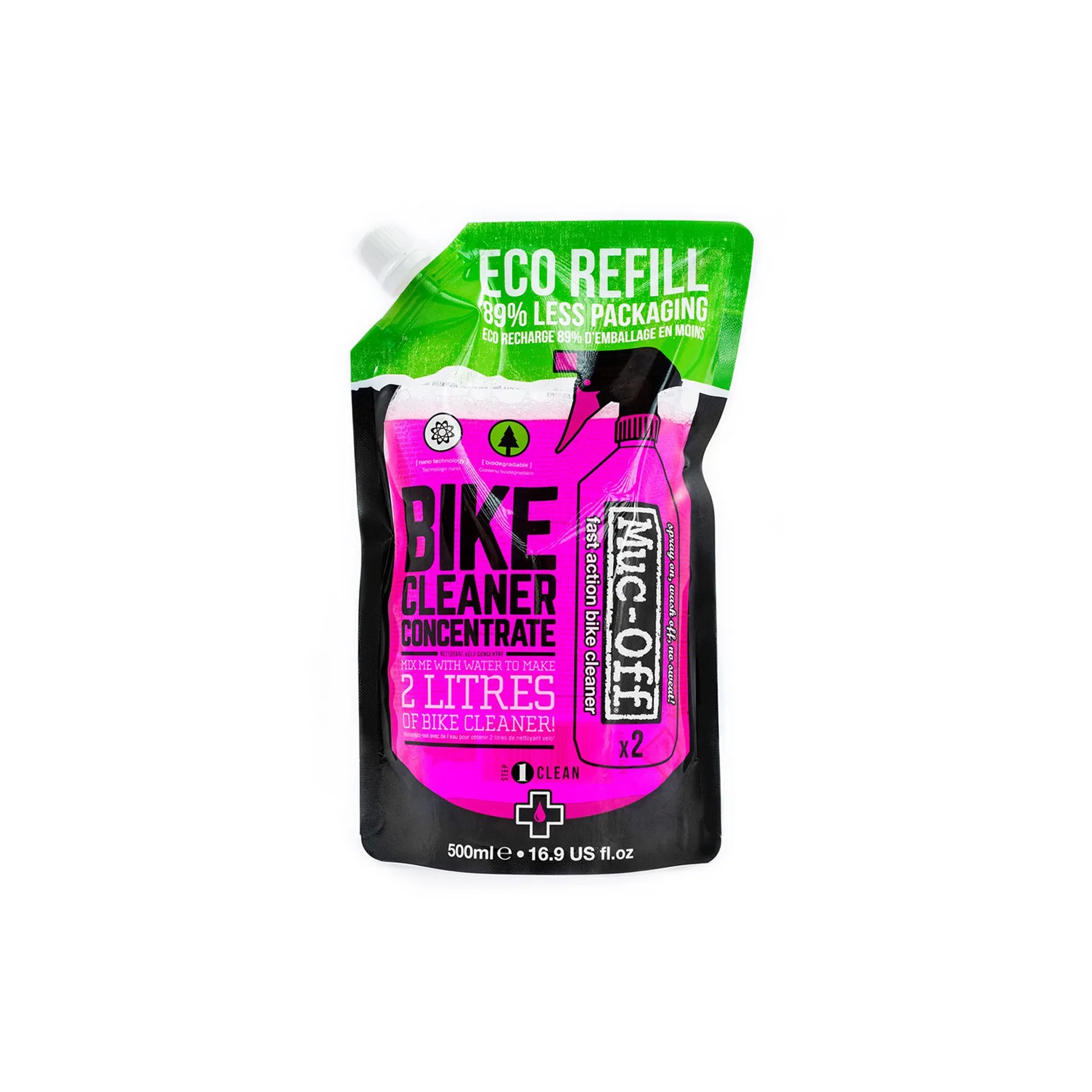Re-using is even better for the environment than recycling, and that’s what makes the Bike Cleaner Concentrate so amazing. Each Bike Cleaner Concentrate pouch uses 89% less packaging than the equivalent 2 bottles of 1 litre Muc-Off Bike Cleaner. So don’t chuck out your old Bike Cleaner bottle; save it and save the planet.